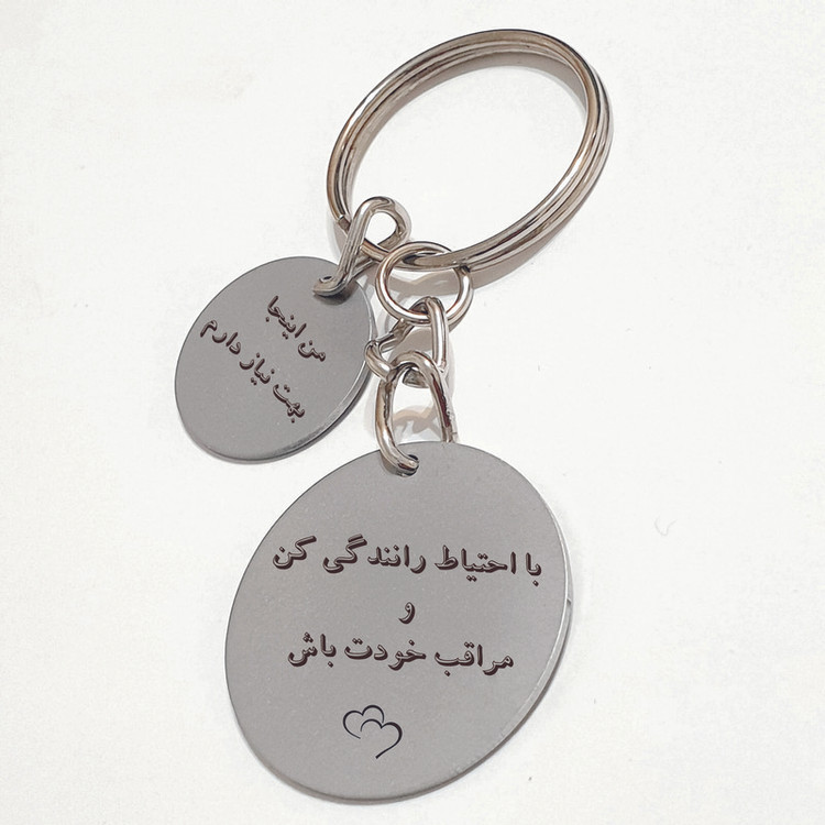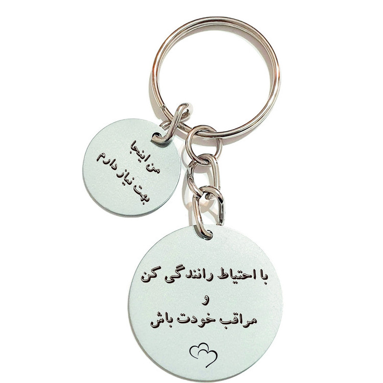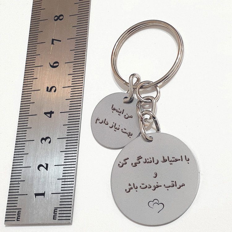 این جاسوئیچی زیبا شامل دو عدد پلاک دایره شکل به قطر 20 میلیمتر و 30 میلیمتر و ضخامت 1 میلیمتر میباشد. یک جمله زیبا (با احتیاط رانندگی کن و مراقب خودت باش... من اینجا بهت نیاز دارم) بر روی این دو پلاک حک شده است. این جاسوئیچی، یک هدیه خاص برای عزیزانتان است. جنس این پلاک، استیل ضد زنگ بوده که به مرور زمان دچار تغییر رنگ نمیشوند.