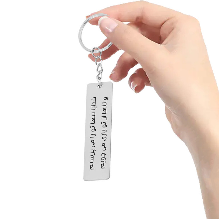 این محصول زیبا از جنس استیل آلیاژی ساخته شده و کاملا رنگ ثابت و مقاوم در مقابل رطوبت می باشد این جا کلیدی زیبا با جمله خدایا تنها تو را می پرستم و تنها از تو یاری می جویم مزین شده که قسمتی از سوره مبارکه حمد می باشد که در اثر استفاده روزانه و به چشم خوردن آن در طول روز باعث اثری شگرف در ضمیر ناخودآگاه انسان خواهد بود